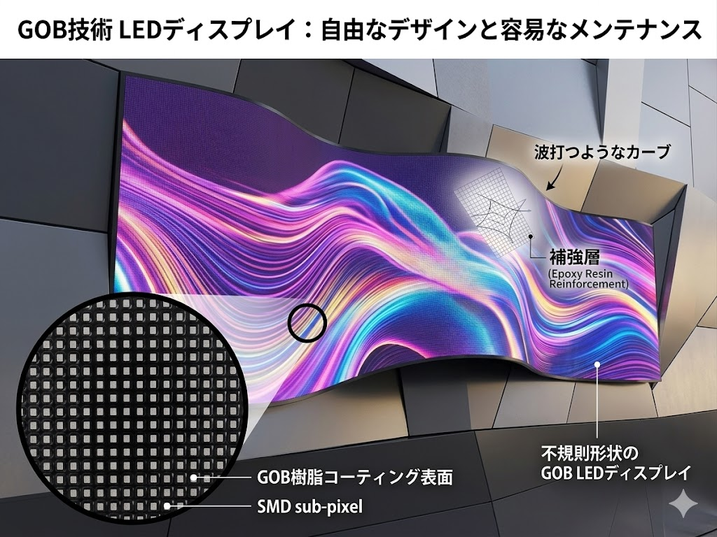 GOB技術は、こうした不規則な形状のディスプレイを作る際にも強みとなります。曲面を作るためにパネルを曲げる工程では、表面の素子に負荷がかかりやすいのですが、薄い樹脂の層で補強されていることで、加工時のトラブルを抑えることができます。