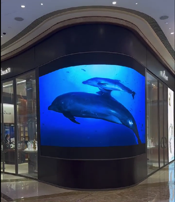 3D広告の没入感を高めるために有効なのが、L字型などの「湾曲ディスプレイ」の活用です。角を利用しやすく、2つの面をまたぐことで奥行きを表現できます。