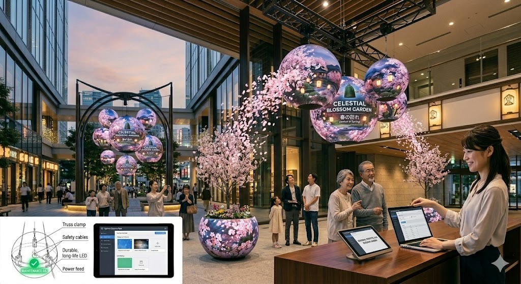 導入にあたって、こうした不安を感じる方も少なくありません。しかし、現在のシステムは操作性も考慮されており、普段使いのパソコンから映像の切り替えやスケジュール設定を簡単に行えるようになっています。また、設置工事においても、球体の自重を支える強固なスタンドや、天井から吊るすための専用器具など、現場の状況に合わせた最適な工法が選ばれます。