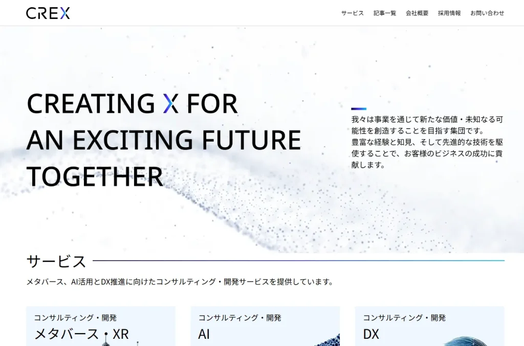 ご紹介いただいた記事集客支援に強いおすすめのWEBマーケティング会社を紹介株式会社CREXは、メタバース・AI・DX領域に特化したコンサルティングと開発支援を行う企業です。企画から運用まで一貫してサポートし、幅広い業界のデジタル活用を推進しています。 -