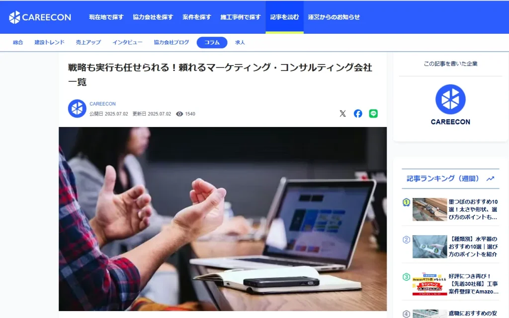 BRANU株式会社 の運営する建設業界向けマッチングサービス「CAREECON」内の記事「戦略も実行も任せられる!頼れるマーケティング・コンサルティング会社一覧」に当社が掲載されました。 -