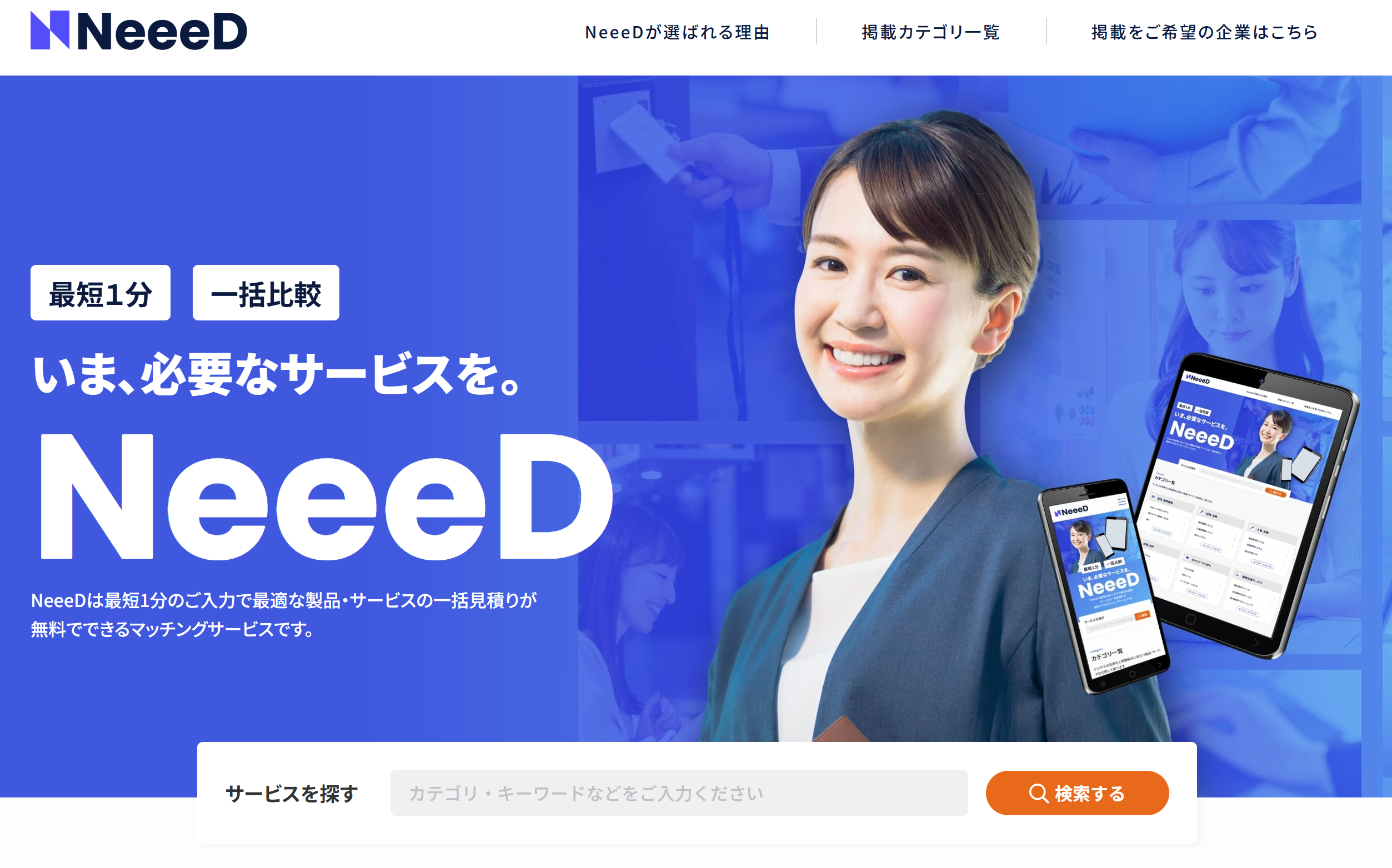 NeeeD はビジネスの効率化と問題解決に役立つ製品・サービスを一括で比較・見積もりできる無料のマッチングサービスです。