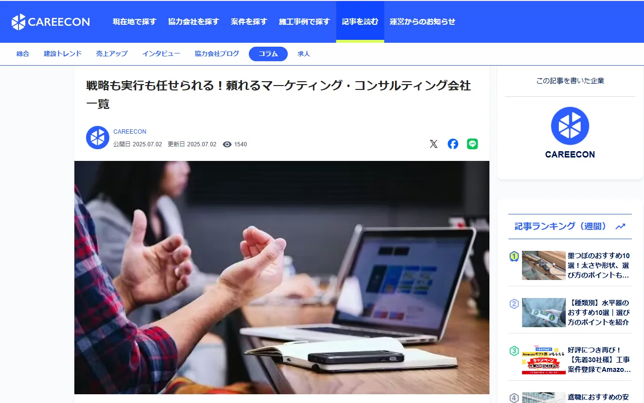 BRANU株式会社の運営する建設業界向けマッチングサービス「CAREECON」に当社が掲載されました 2025 10/16 2025年9月29日2025年10月16日 BRANU株式会社 の運営する建設業界向けマッチングサービス「CAREECON」内の記事「戦略も実行も任せられる!頼れるマーケティング・コンサルティング会社一覧」に当社が掲載されました。 各LEDビジョンについて詳しく見る 屋内用LEDビジョン 屋外型LEDビジョン シースルー(透過型)LEDビジョン キューブ型LEDビジョン 円型LEDビジョン 小型LEDビジョン デジタルサイネージの導入について LEDビジョンの選び方 LEDビジョン導入の流れ デジタルサイネージ映像制作 レンタル・リースでLEDビジョンを設置する お客様の声 あわせて読みたい LEDビジョン設置が初めての方へ LEDビジョンの設置が初めての店舗、企業様へ当社が企画からご提案しサポート致します。 無料相談を受け付けておりますのでお気軽にご利用ください。 無料相談はこちら ... よかったらシェアをお願いいたします。 URLをコピーしました! URLをコピーしました!
